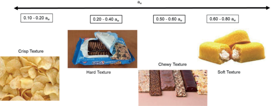 Bakery products are known for their pleasing texture and taste and each product has its own unique organoleptic requirements. The most common mode of failure in baked products is an unexpected change in texture or flavor. For example, a butter biscuit should be crispy, and a cake should show a good mixture of firmness and moisture. Figure 1 shows the water activity range for baked snacks and the expected texture for each region. Changes in water activity will result in changes in texture and each baked product has an optimal water activity range where the texture and taste will be ideal. The key then to prolonging the shelf life of these products is to manufacture them to that ideal water activity and maintain that water activity during storage and transport with effective packaging.