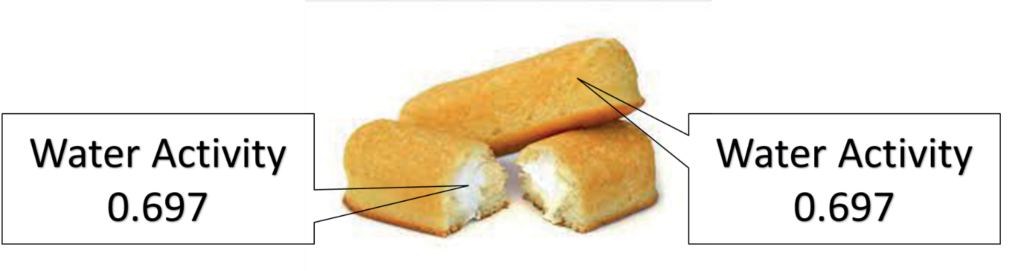 Many bakery products contain multiple components such as a cream filling or an icing covering. For These products, moisture migration between components can lead to undesirable texture changes or even susceptibility to microbial growth. Moisture moves from high water activity to low water activity, so the way to prevent moisture migration and its accompanying consequences is to match the water activity of the components. The icing, cake, and cream filling of a snack cake all need to be manufactured to the same water activity before being combined and then, even if their moisture content is different, there will be no moisture migration between the components